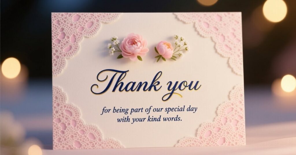 Keep it warm and simple: “Thank you for celebrating our joy with your thoughtful message.”