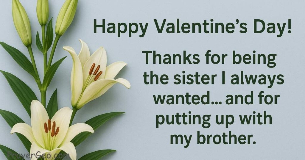 Send a warm and personalized Valentine’s Day message expressing your love and gratitude, such as “Happy Valentine’s Day to my wonderful sister you make life brighter every day.”